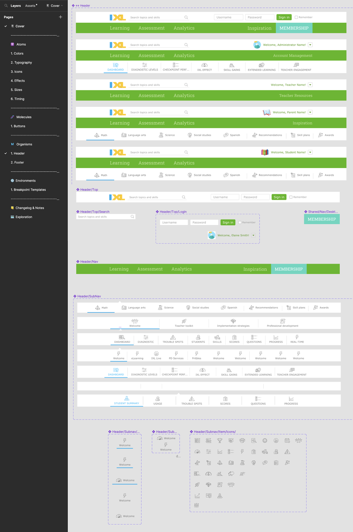 A concrete example of this approach was the IXL header. By decomposing it into atomic elements such as buttons, icons, and typographic units, we created a flexible structure that could adapt to different contexts without fragmenting the system. Consistent rules around color, spacing, and typography ensured visual cohesion across platforms and devices.