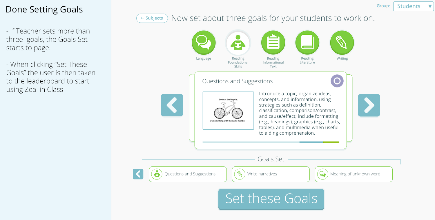 During the development of Zeal, we incorporated a powerful feature called Goal Setting. This feature was designed to empower teachers by enabling them to set specific skills as goals for their students. To ensure its usability and effectiveness, we conducted several rounds of prototyping and testing with teachers.